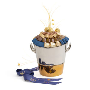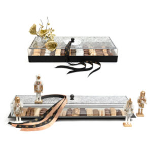 Cloche en plexiglass dressée sur plateau rectangle en métal Noir & Blanc garnie de chocolat