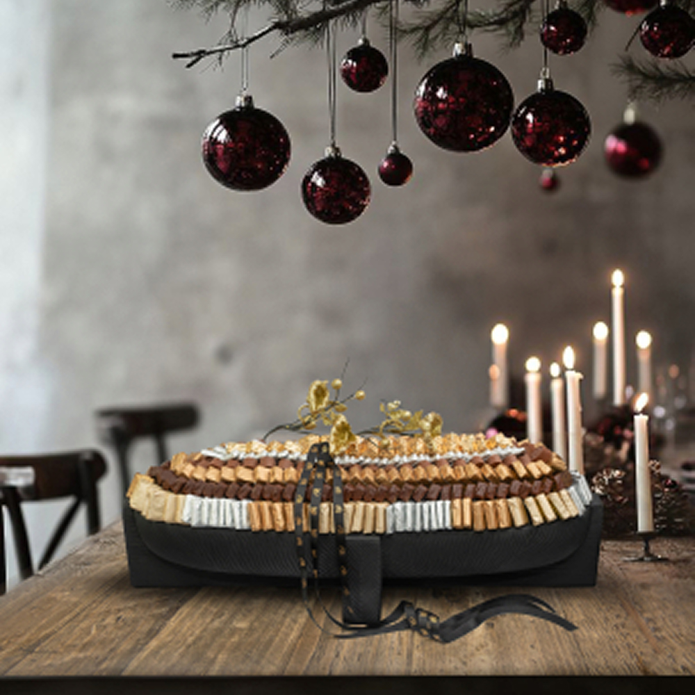 Coupe ovale sur socle en porcelaine noire effet bois garnie de chocolat