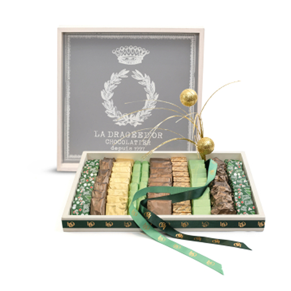 Plateau carré en bois avec écusson La Dragée d’Or garnie de chocolat
