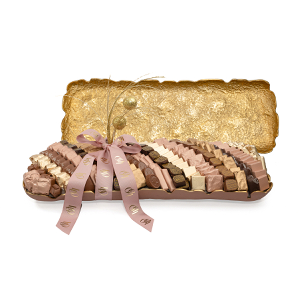 Superbe coupe ovale en métal coloré garnie de chocolat