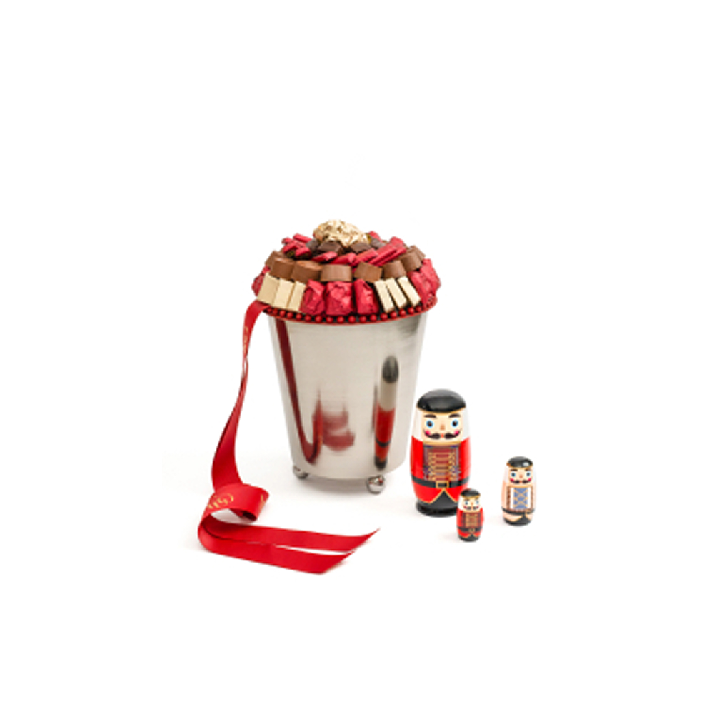 Seau sur pieds en métal rouge et argent – 900gr – garnie de chocolat
